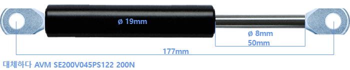 AVM SE200V045PS122 200 뉴턴 의 대체 가스스프링. 아일렛의 두께는 10mm이고 구멍 직경은 8.1mm입니다. 브랜드: HAHN, 스타빌루스