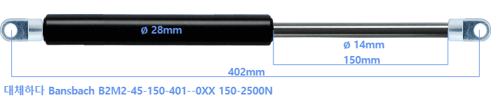 Bansbach B2M2-45-150-401--0XX 150-2500 뉴턴 의 대체 가스스프링. 아일렛의 두께는 10mm이고 구멍 직경은 10.1mm입니다. 브랜드: HAHN, 스타빌루스