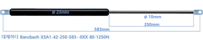 Bansbach X3A1-42-250-583--0XX 80-1250 뉴턴 의 대체 가스스프링. 아일렛의 두께는 10mm이고 구멍 직경은 8.1mm입니다. 브랜드: HAHN, 스타빌루스