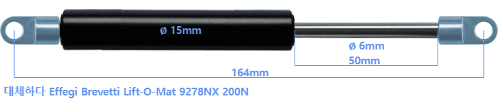 Effegi Brevetti Lift-O-Mat 9278NX 200 뉴턴 의 대체 가스스프링. 아일렛의 두께는 3mm이고 구멍 직경은 6.1mm입니다. 브랜드: HAHN, 스타빌루스