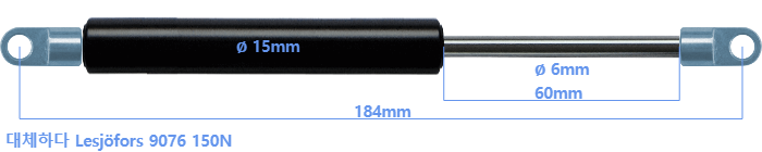 Lesjöfors 9076 150 뉴턴 의 대체 가스스프링. 아일렛의 두께는 3mm이고 구멍 직경은 6.1mm입니다. 브랜드: HAHN, 스타빌루스