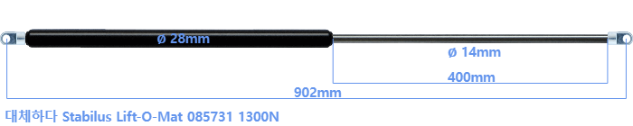 Stabilus Lift-O-Mat 085731 1300N 의 대체 가스스프링.아일렛의 두께는 10mm이고 구멍 직경은 10.1mm입니다. 브랜드: HAHN, 스타빌루스