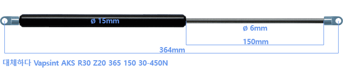 Vapsint AKS R30 Z20 365 150 30-450 뉴턴 의 대체 가스스프링. 아일렛의 두께는 3mm이고 구멍 직경은 6.1mm입니다. 브랜드: HAHN, 스타빌루스